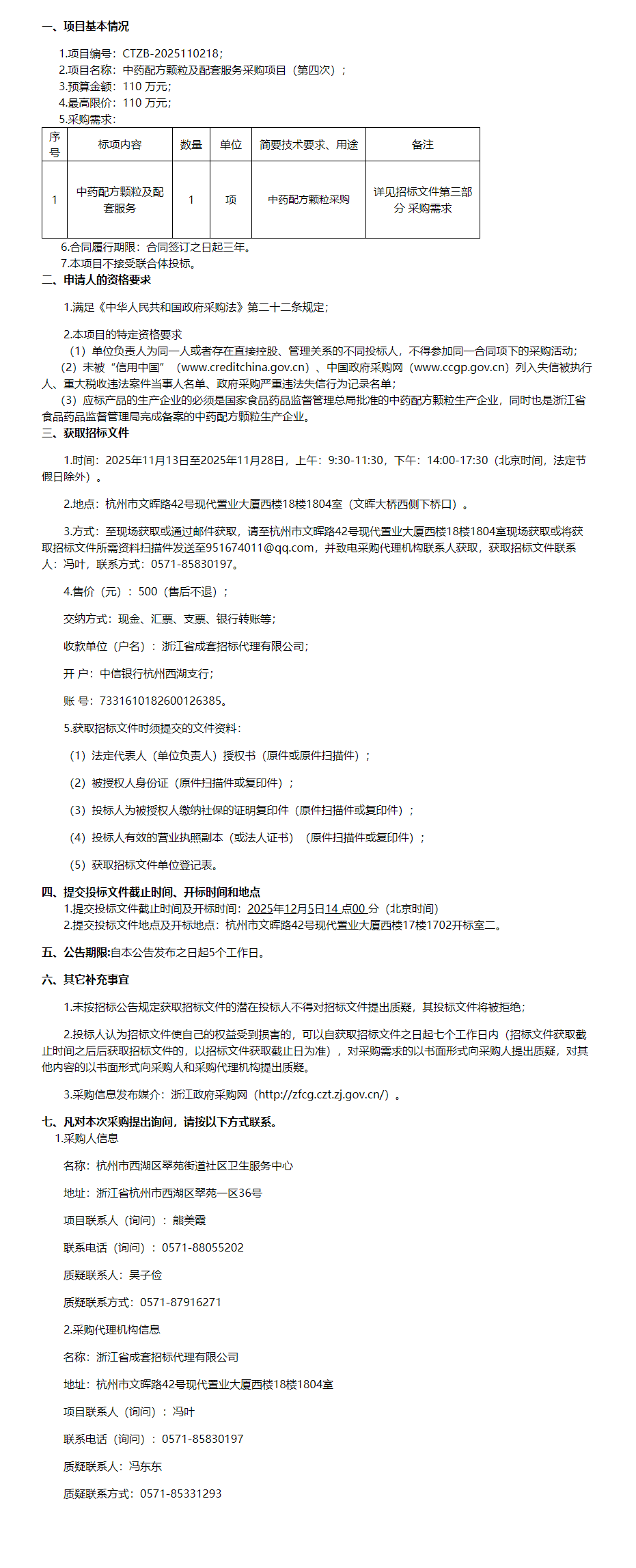 【杭州市西湖區(qū)翠苑街道社區(qū)衛(wèi)生服務(wù)中心】浙江省成套招標(biāo)代理有限公司關(guān)于杭州市西湖區(qū)翠苑街道社區(qū)衛(wèi)生服務(wù)中心中藥配方顆粒及配套服務(wù)采購(gòu)項(xiàng)目(第四次)的公開(kāi)招標(biāo)公告(非政府采購(gòu))