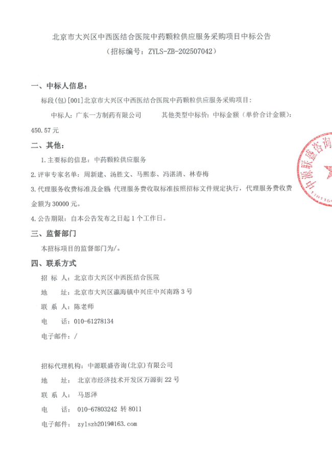【北京市大興區(qū)中西醫(yī)結(jié)合醫(yī)院】北京市大興區(qū)中西醫(yī)結(jié)合醫(yī)院中藥顆粒供應(yīng)服務(wù)采購(gòu)項(xiàng)目中標(biāo)公告