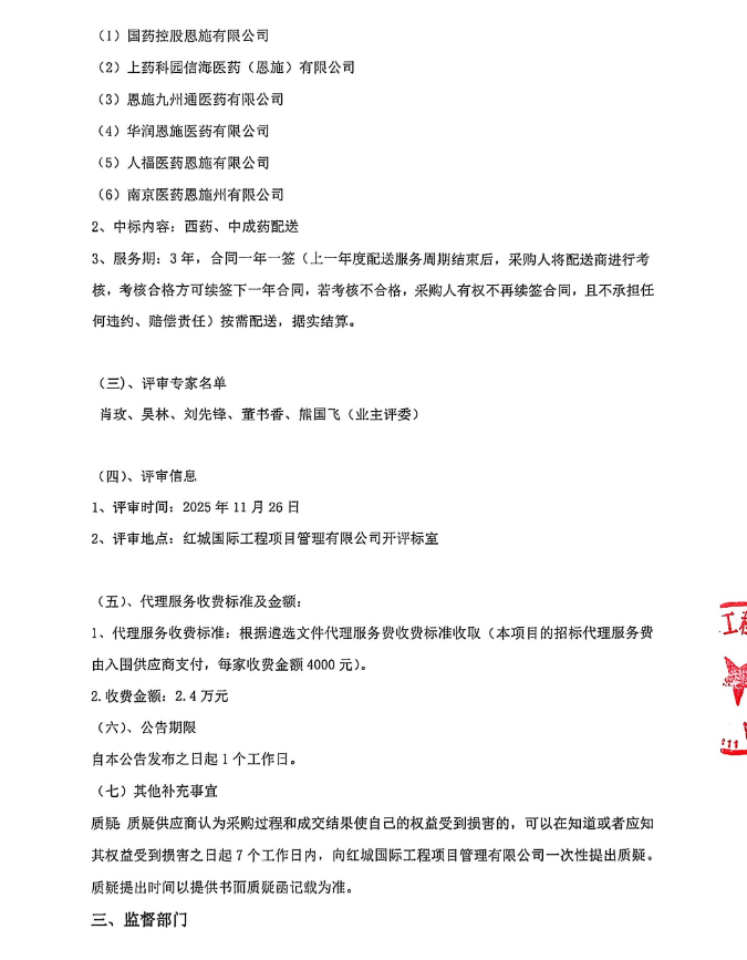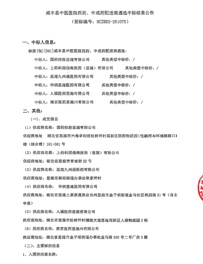 【恩施土家族苗族自治州咸豐縣中醫(yī)醫(yī)院】湖北省恩施土家族苗族自治州咸豐縣中醫(yī)醫(yī)院西藥、中成藥配送商遴選中標(biāo)結(jié)果公告