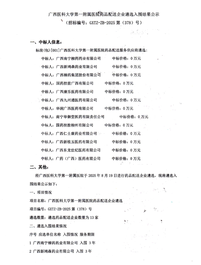 【廣西醫(yī)科大學(xué)第一附屬醫(yī)院】廣西醫(yī)科大學(xué)第一附屬醫(yī)院藥品配送企業(yè)遴選入圍結(jié)果公示