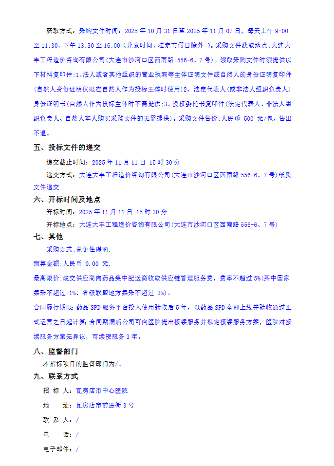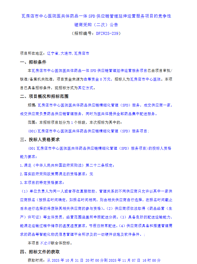 【大連市瓦房店市中心醫(yī)院】遼寧省瓦房店市中心醫(yī)院醫(yī)共體藥品一體SPD供應(yīng)鏈管理延伸運(yùn)營(yíng)服務(wù)項(xiàng)目的競(jìng)爭(zhēng)性磋商采購(gòu)(二次)公告