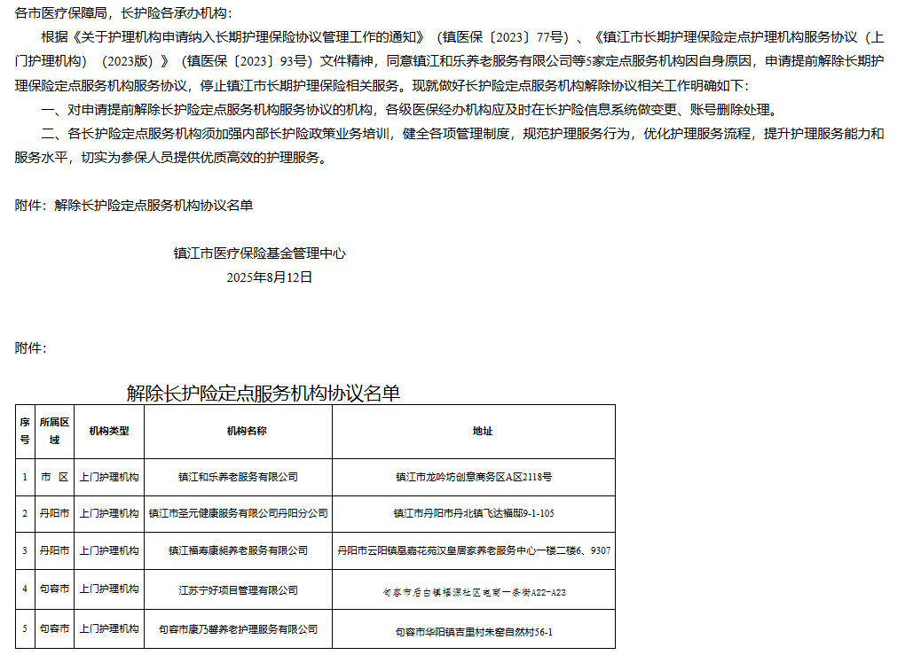 【鎮(zhèn)江】關(guān)于鎮(zhèn)江市長(zhǎng)期護(hù)理保險(xiǎn)定點(diǎn)服務(wù)機(jī)構(gòu)解除協(xié)議的公告